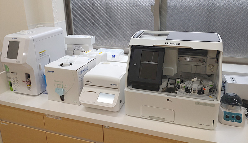 当院では血算(白血球、赤血球、血小板 等)や生化学検査(肝機能、腎機能、コレステロールや中性脂肪、血糖、電解質 等)、炎症反応(CRP)や糖尿病の指標となるHbA1cといった血液検査項目は院内で測定可能であり、即日結果をお伝えすることができます。また上記以外の血液検査(甲状腺機能、自己抗体の有無、血液凝固検査)については外部委託を行い、症状や疾患に応じた検査が可能となっています。